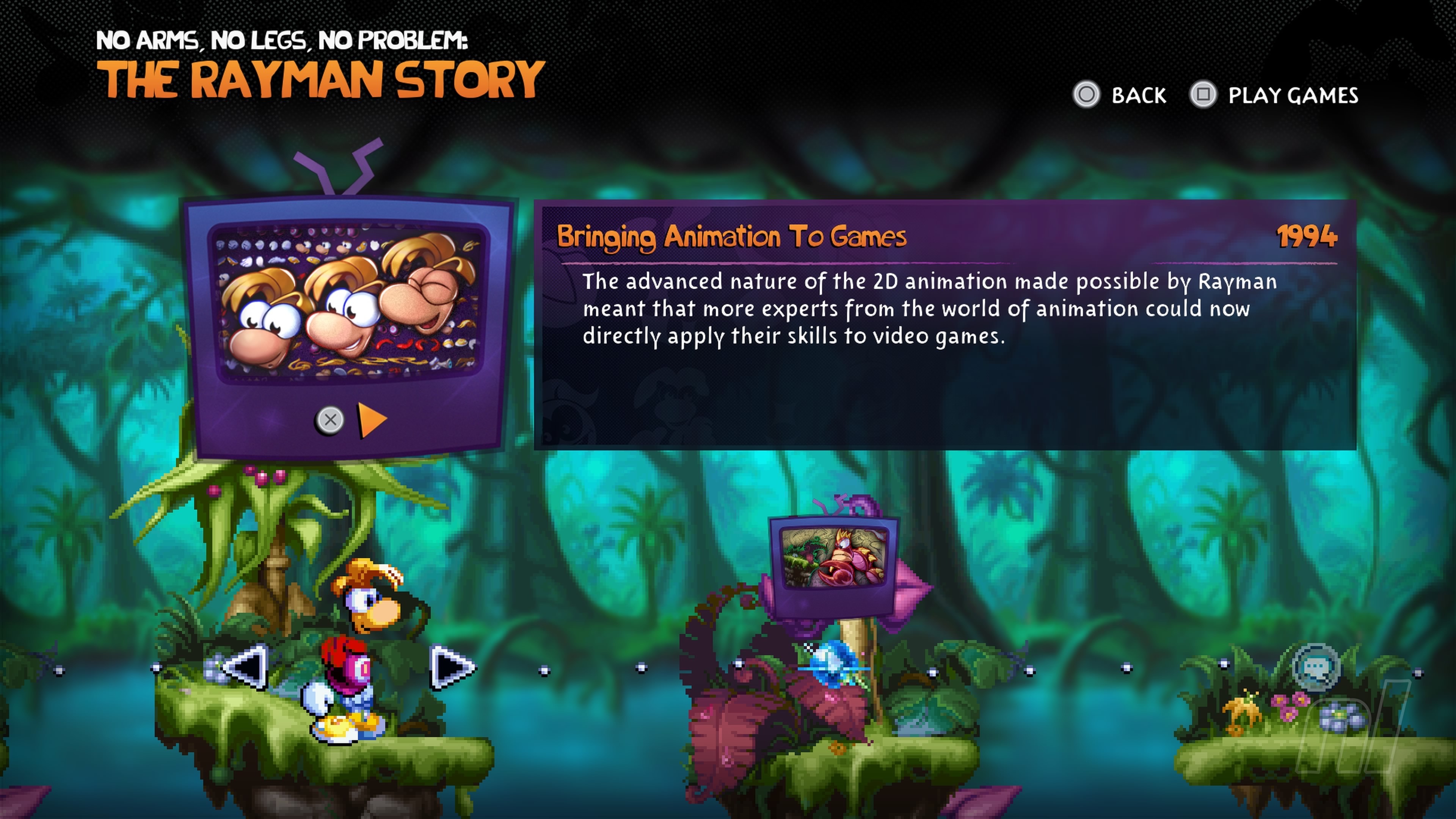 When not playing through a version of Rayman, you can explore a detailed history spanning the development cycle of the first title, ending with Ubisoft's first teaser for Rayman 2.
